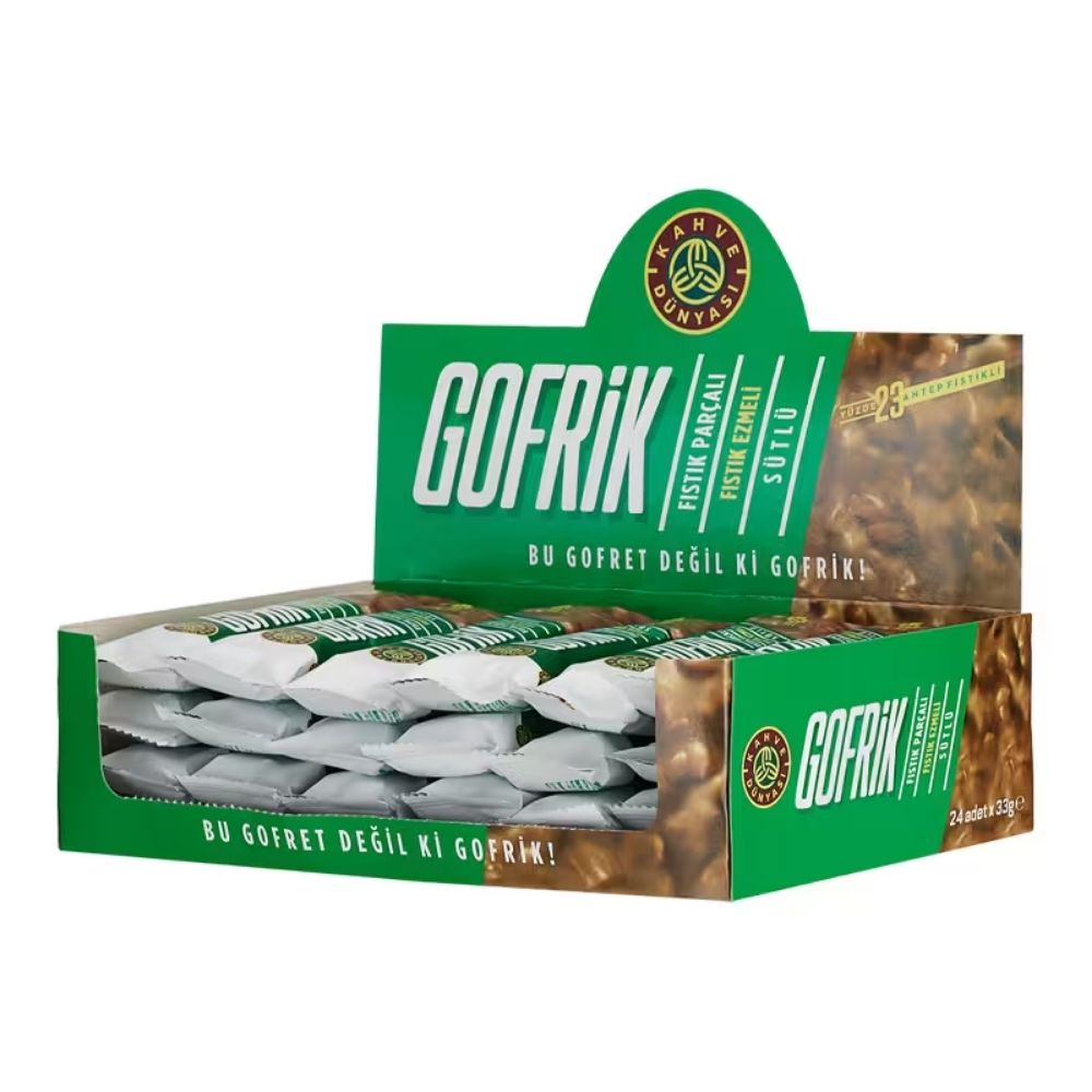 Experience the premium taste of Kahve Dünyası Gofrik Milk Chocolate with Pistachio Pieces, a masterfully crafted snack combining velvety milk chocolate, roasted pistachio pieces, and smooth pistachio paste. Unlike ordinary wafers, Gofrik offers an elevated crunch and nutty richness with every bite.